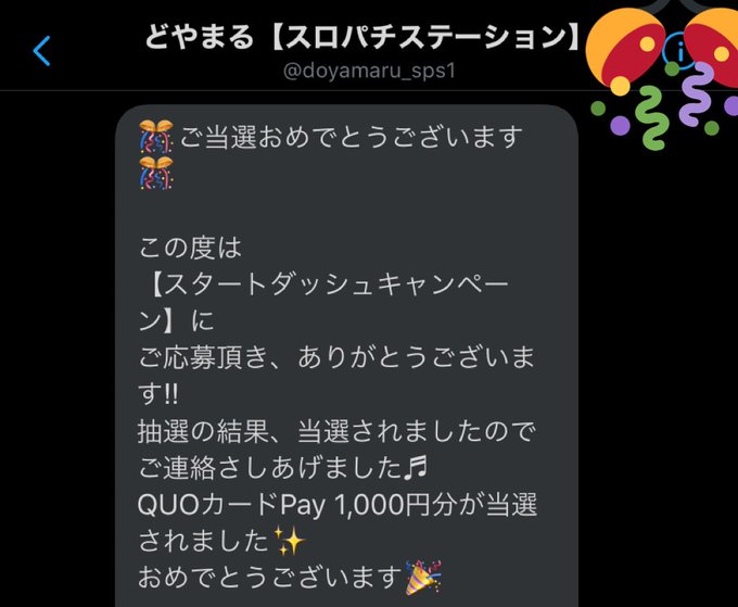 @doyamaru_sps1 (どやまる【スロパチステーション】)さんより 『スタートダッシュキャンペーン』でその場でQUOカードPay1000円分が当選しました🌷 このたびはありがとうございました(^。^)✨ #当選報告 #懸賞垢さんと繋がりたい #懸賞好きな人と繋がりたい #懸賞仲間募集中