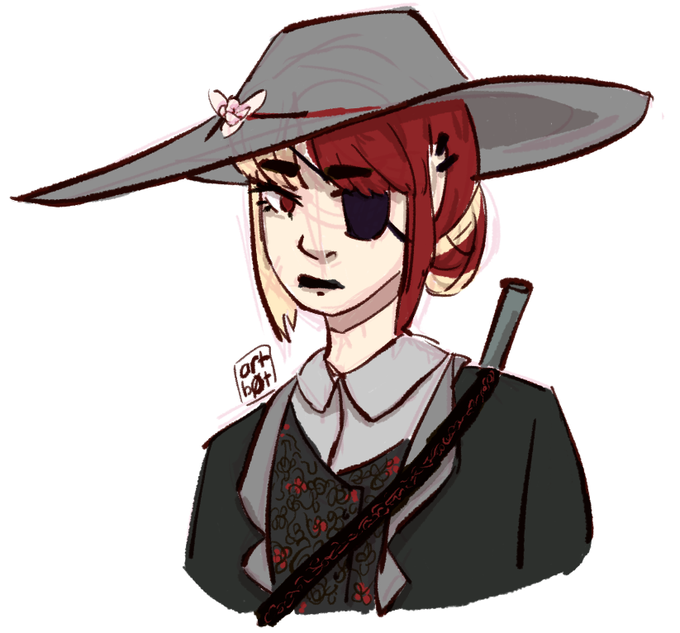 wip of the oc i made my hair purple for... sweet mahoney sorry you died 😔