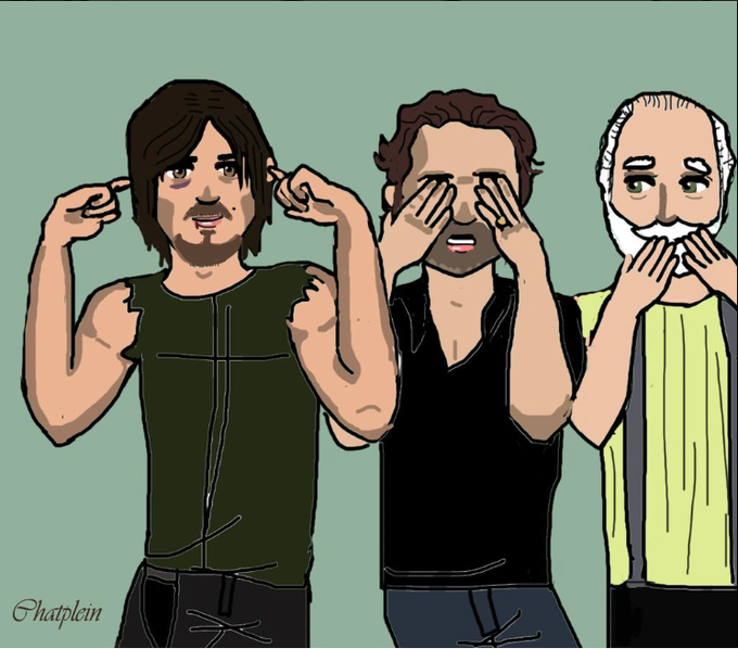 Hear no evil, see no evil, speak to evil. Artist: @Chatplein