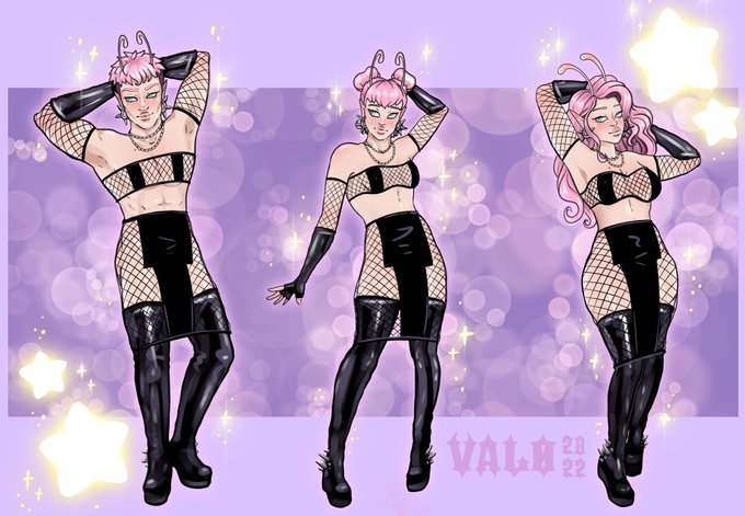 this is Omni, a shapeshifting alien babe who can vaguely read ur mind to take the physical form you most desire. These are just a couple examples and by no means the limit of its powers. #oc #digitalart #queerart #nonbinary #genderfluid #valo2022