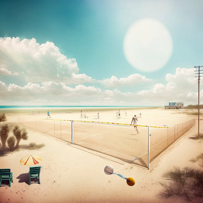 ✏️ Instrução/Prompt: playing beach tennis on an island, ultrarealistic, panorama, dreamy, sunny --q 2