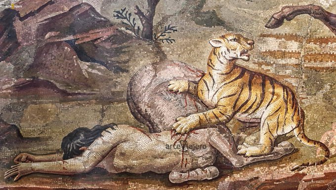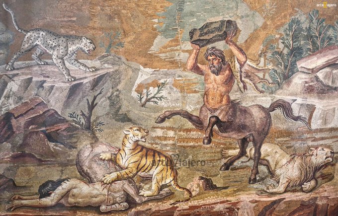 Este bellísimo mosaico romano nos ilustra con una lucha entre un centauro y varios felinos que han matado a su compañera y su hijo. La pieza, datada en el S. II d. C, fue encontrada en Villa Adriana (Tivoli, #Italia) y en la actualidad se custodia en el Altes Museum (#Berlin)