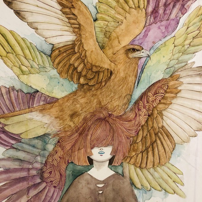 迫ってくる雄大な鳥、色合い、構図を対比し、鳥に対する気持ちは人を通して表現。