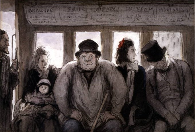 Horse-drawn “omnibuses” (from Latin “for everybody”) originated in France & proliferated in the 1850s, providing a new mode of cheap transport for all classes, sexes & ages ~ & an early opportunity for manspreading. Depicted here by Daumier, GW Joy and Delondre
