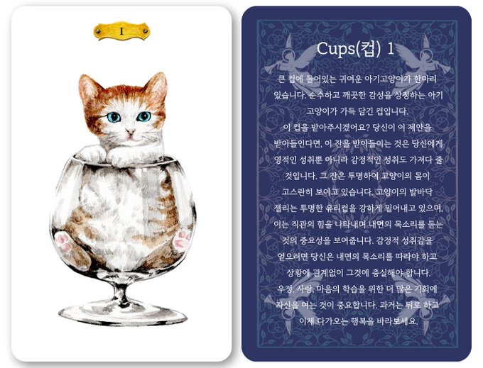 오늘은 성취와 관련된 [컵-1번] 카드의 제너럴버전이 리스팅되었습니다. 새로운 변화와 시도, 도전을 앞둔 분께 어울리는 카드가 나왔네요!