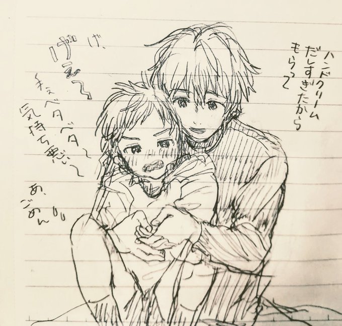 #一次創作BL版深夜の真剣120分一本勝負 お久しぶりです!! ハンドクリームをお題に描きました。 一枚目は兄の恋人が少し気になる弟で、二枚目はバカップルです。
