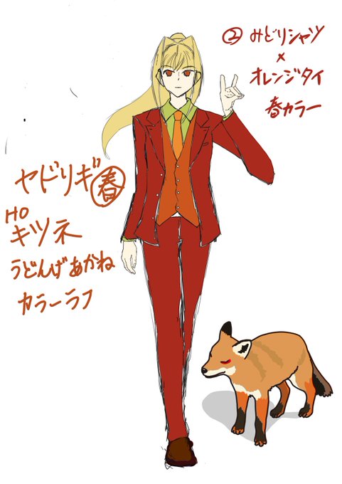 褒められたくなったのでヤドリギ狐🦊のカラーラフ! 大人の男装女子×狐耳を実現するのに「大きめインテーク」というアンサー出せたの偉くない??? 髪の毛はね、ポニテだけどポニテではない。フォックステールです。