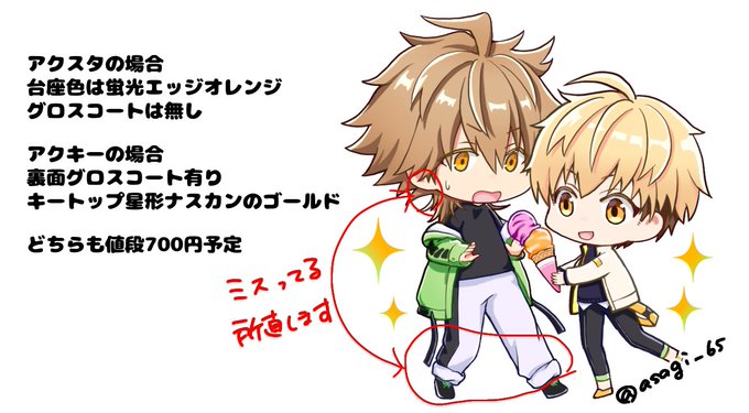 できた!もう少し調整するかもですが一応アンケ置くので宜しければ…🙇♀️ この絵柄の兄弟アクスタを自分用に作ろうと思っていますが、欲しい方いらっしゃったりしますか…? 仕様は画像に お値段800か850+(もし複数いらっしゃればBOOTHに置いてみようかなと考えています。発送は匿名で送料370円)