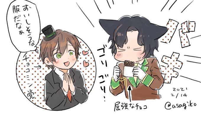 屈強なチョコを食べる先輩とチョコミント食べたいヒナト君描きました✏️
