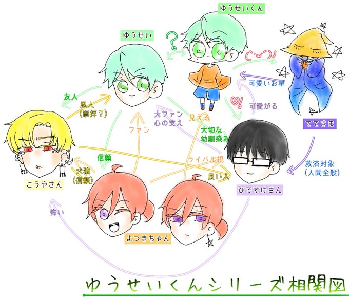 そういえばゆうせいくんシリーズ相関図描いたんだ。相変わらずごちゃごちゃしてますねぇ!!! まだ増えるかもしれないから暫定。