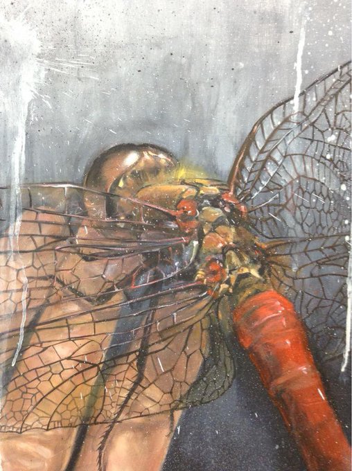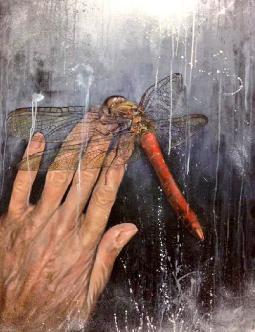 華奢で弱々しく見えるトンボの翅と老いた手。しかし、かえって生命力を感じるのは、その浮き出た骨格や脈に"生きること"を思うからではないだろうか。