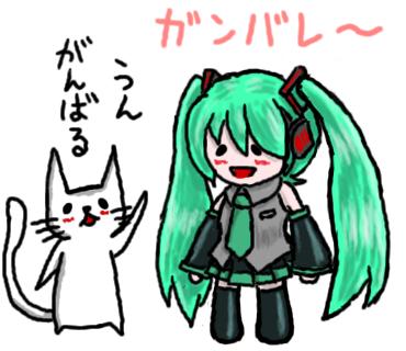 「初音ミクさんとちびねこ」の図。 思えばミクさんで曲を作り始めて、もうすぐ3年…。 最初の頃はミクさんの声の調整にとてつもなく苦労したのも、いい思い出。