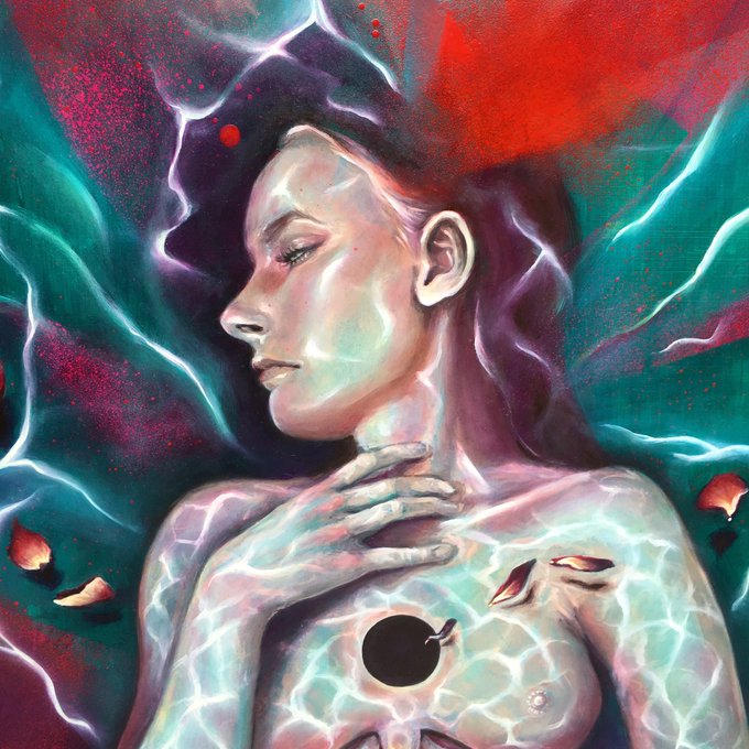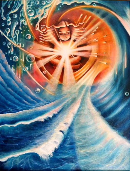 The Birth of Water, 2018 - acrylic paint... mischtechnik: tempera grassa, oil paint. This was about 6 months of to and fro... Stoked it is now complete #TheBirthofWater #MissDarq #Mythos #artistsontwitter #painting #visionaryart #watergoddess