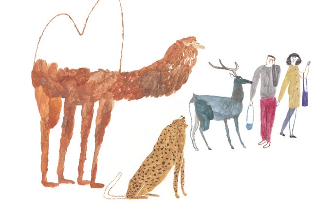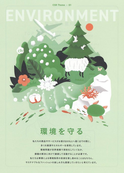 昨年、アダストリアさんのCSR活動の紹介のために描いたイラストです。中央の白く角ばった花は、都市や会社、デジタルテクノロジーなどの象徴で、自然環境との共生をイメージして描きました。