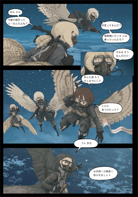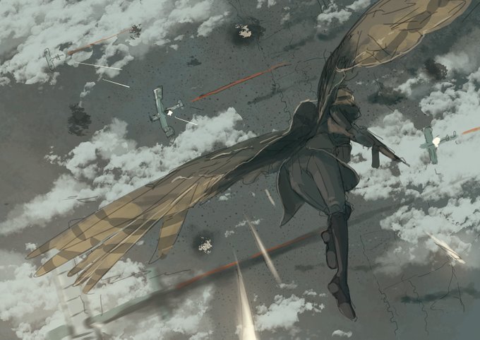 戦闘機が巨大生命体と戦う漫画の作画をさせて頂きながら、翼人達が空で戦ったりする絵も描いたりしています。お見知りおき頂けましたら幸いですー