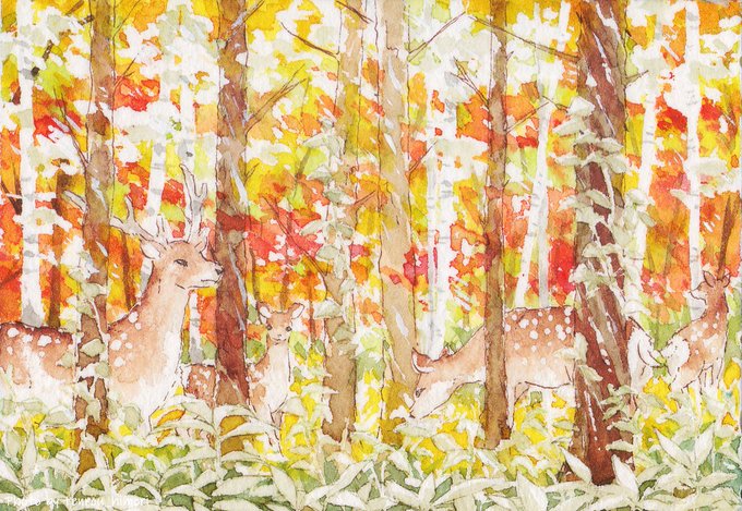 #水彩行進曲 19/31「道草」 エゾシカのハーレム