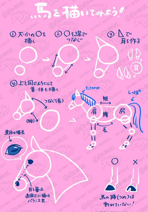 絵チャ参加出来ない方でも話が分かりやすいように以前描いた馬の描き方資料載せておくので良かったら🫶