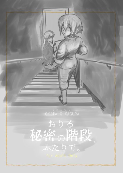 というわけでひさびさ、冬の新刊進捗始めます。よろしくお願いします。まずは表紙ラフです。タイトルは「おりる秘密の階段、二人で。」センター合わせやタイトルロゴの微調整はおいおい。#2021冬新刊進捗