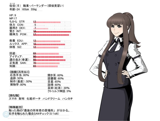 ブルワン新キャラの佐伯です。元探索者。オカルト関連の情報屋で、鈴木さんと立花さんの仲介に立つことが多い。学があるというより自頭が良いタイプ。病気かよというレベルで貧弱なのでオフィスワークがメイン。