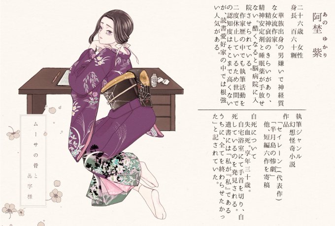 ムーサの骨と品字様(@Musa_kabe)に参加させて頂きます。三人目、幻想怪奇小説家の阿埜 紫です。