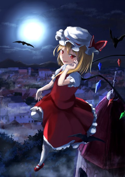 #フラン #東方プロジェクト #イラスト ちかれた 課題がいっぱい出たので収穫はあったかな 中景は写真合成しました。ご意見、感想、アドバイスなどなんでも是非お願いします~