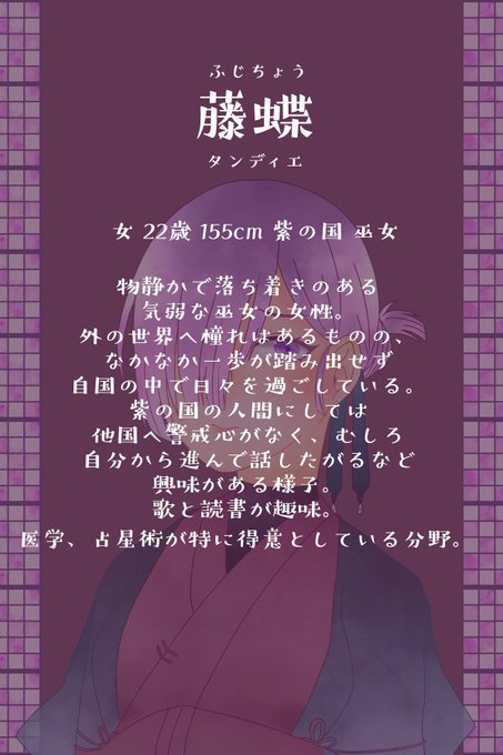 こちらの企画【@4sai_denki_TL】に二人目の参加失礼いたします。関係等は真っ白ですので沢山遊んで頂ければ嬉しいです、よろしくお願いします😄 #四彩伝記_CS #四彩伝記_紫の国 #四彩伝記_巫女