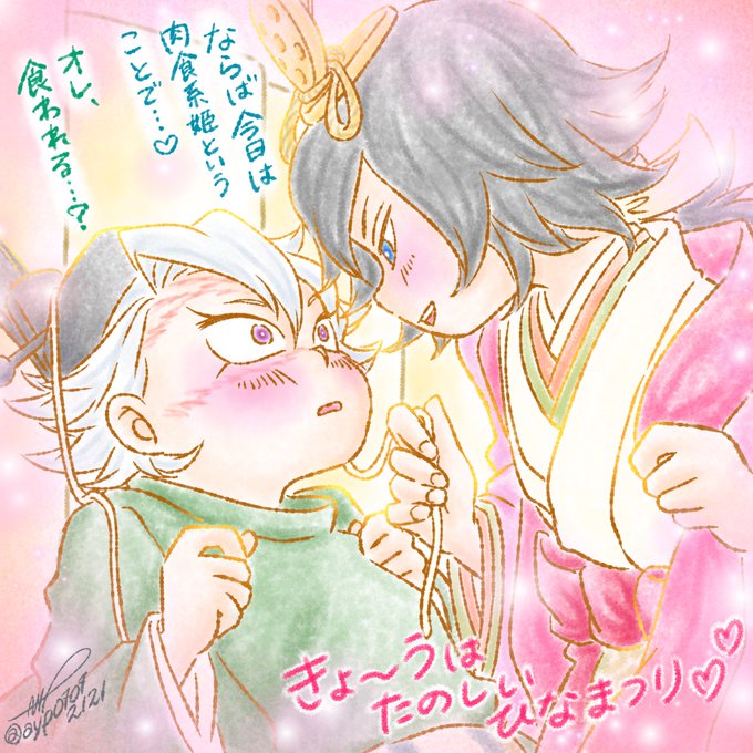 #ぎゆさね版ドロライ 運営さま、いつもありがとうございます! 遅刻で失礼します… お題「もも」 何のひねりもない🍑の節句🌸 作者的には黒髪のが十二単は似合う気がしたのでこの配置で😅