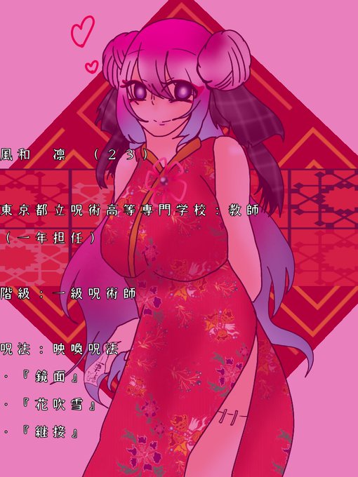 風和 凛(23)📝💕 7年後は高専の教師をしており、チャイナドレスを着るようになる。 呪霊との戦いによって右腕と左脚を吹っ飛ばされるが、術式でくっつけたとか??? また、ある呪霊を呼び出すことができるという噂があったりなかったり。 #夢術廻戦 #juju夢 #じゅじゅ夢 #夢主