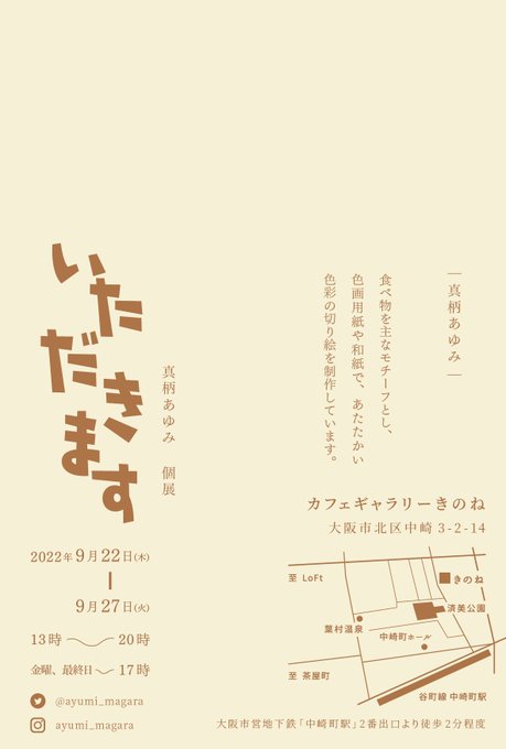 真柄あゆみ個展【いただきます】 9月22日(木)~27日(火) 13時~20時(金曜・最終日は17時まで) カフェギャラリーきのね @kinone_cg 大阪市北区中崎3-2-14 大阪メトロ中崎町駅より徒歩2分 入場無料