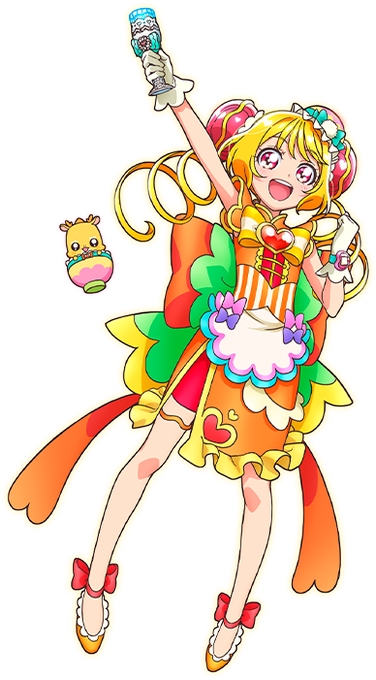 A relaxed, straight forward and energetic 2nd year JHS student. She lives in a diner, and is an only child. She has outstanding physical drive and gets hungry quickly. She often says "Deliciousmile!" and "I'm hungry". She loves raw veggies.