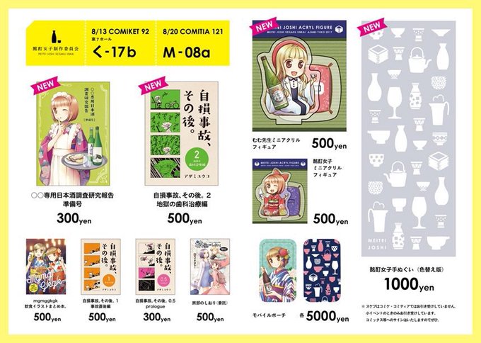 【告知】おはようございますー!本日の新刊は『自損事故、その後2〜地獄の歯科治療編〜』と『○○専用日本酒調査研究報告 準備号』あとてぬぐい色替え版とむむ先生ミニアクリルフィギュア!8/13 3日目東7く-17b 酩酊女子制作委員会でおまちしてますよー #C92