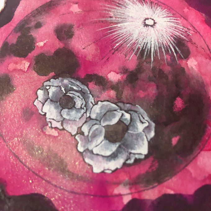 今夜はピンクムーン🌕✨🌸ということで、ピンクムーンの絵を載せておきます! 名前の由来は、シバザクラが野原一面に絨毯を広げるように咲くことから来ているとか。 絵にもシバザクラを敷き詰めてみました! #ピンクムーン #illustration #ペン画 #顔彩 #ペン画を流してペン画民を増やそう