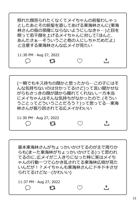 2022年8月~11月くらいまでにツイートした広メイ妄想呟きとSSを文庫本に収録します。面白いです。