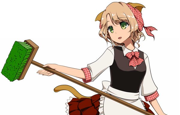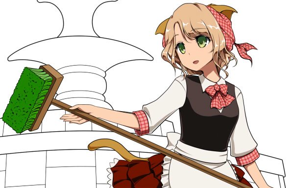 七日目:デッキブラシだし背景は水場がいいかなぁ…じゃあ噴水とかにしようってことでラフ。崩壊したビル郡を背景に「お掃除しますわ。文明という汚れをッ!」っていうのも考えたけどさすがにねぇ…