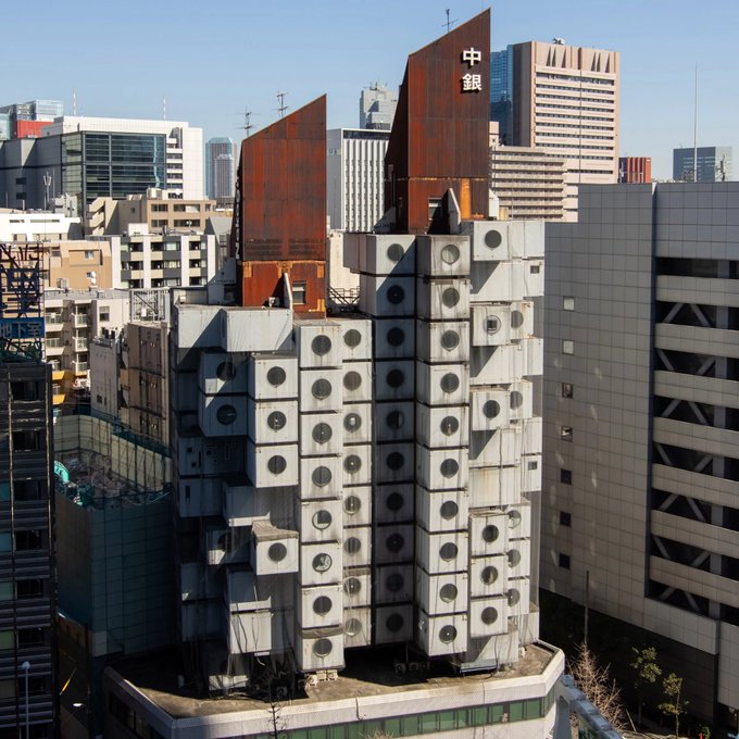 in ikayaki alley, you can see these buildings inspired in the nakagin capsule tower!! these were built with the thought of being able to transport people's belongings from one capsule 'holder' building to another in a different city. sadly, nakagin's were the +