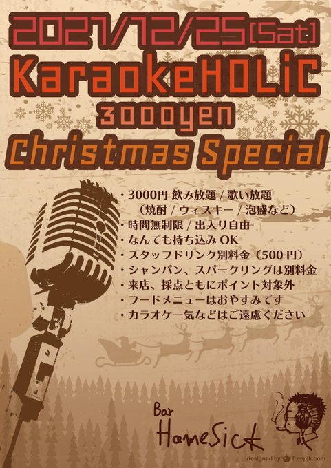 来週12/25(土)はカラオケホリック クリスマス!カラオケが鳴り止むか朝(概念)まで飲み歌い放題です!