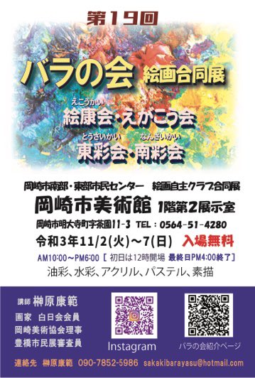 明日11/2の昼12時から展示開始。土曜日までは10〜18時(入場は17時半まで)、最終日は11/7日曜日の16時まで(入場は15時半まで)。#絵画展 #大人の絵画教室