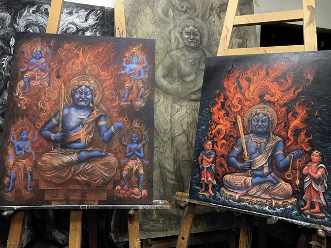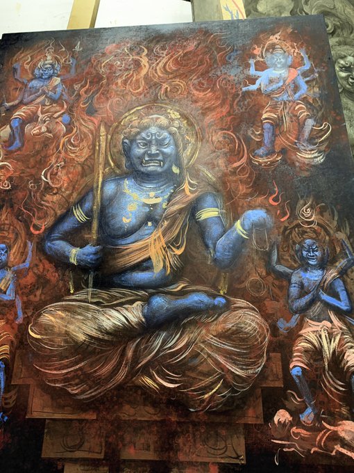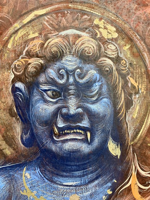 岩絵具を使ってみたいので地塗りなし麻布にアクリルと顔料と墨(グアムの滝の絵と一緒)で描く。油彩とテンペラが続いたので違う実験をする。 #fudomyoo #不動明王 #acrylicpainting #art