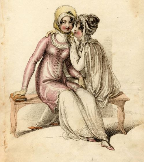 1810年の夕方の散歩や海辺用ドレス。左は白のドレスの上にピンクのローブ、麦わらの帽子。右は白いドレスに白いケープ、ターバン風の帽子と二人ともオリエンタルな要素を感じさせるけど、なんか怪しい雰囲気が良い