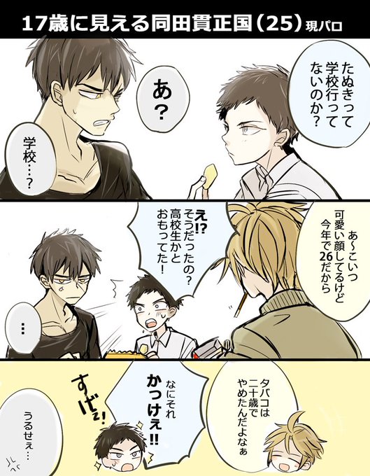 TLに流れてくる刀剣男子の年齢早見表でたぬきが高校生か25前後なの分かりすぎて描いた。17歳か17歳みたいな25~26歳希望。 杵はたぬよりちょっと若いぐらいで 厚はたぬきに憧れてる男子中学生がいい。