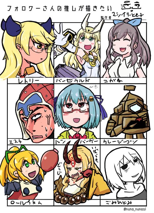 #フォロワーさんの推しが描きたい レトリー バーゼラルド 月岡恋鐘 ミスタ ハンバーガーちゃん クレージーゴン ロールちゃん 茨木童子 吾味人美 9マス描いたぞ!!!!!!!