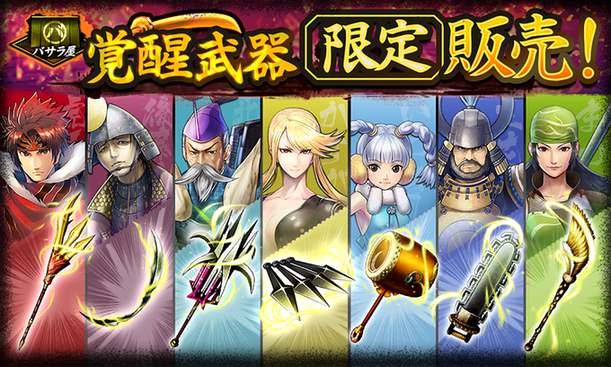 普段は入手が難しいUR武将「虎王・真田幸村」やSR武将「後藤又兵衛」「北条氏政」「かすが」などの覚醒武器が期間限定でバサラ屋に入荷中❗