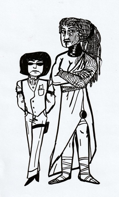 warm-up sketches of designs for backup characters for a sci-fi rpg i play. amiriah loveless, former solder and current space rogue and KD-ZEUS 12, medic android recently exiled from hospital planet.