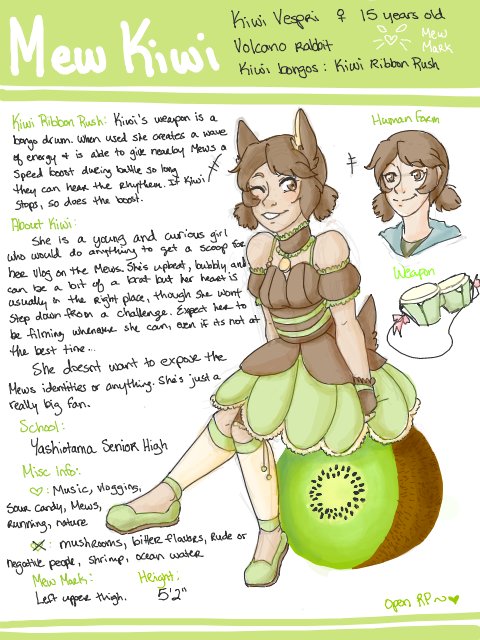 Shout out to my favorite design I've done to date for #Tokyomewmew, Mew Kiwi. Her dress was supposed to be like, a peeled kiwi sort of thing? I love her all the same. #TokyoNewMew sorry I keep spamming the tag, I just love my OCs for TMM so much. They're my babies.