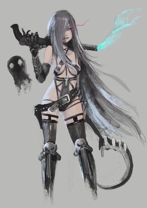 Very swords and sorcery inspired gun witch with gun-powder familiar.