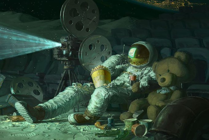 Chongqing, China-based Xision Wu's tender scene of a space explorer spending quality time with a trusted teddy bear while enjoying buttered popcorn and a Hollywood flick really sums up our ongoing 2020 coping strategy. 💛