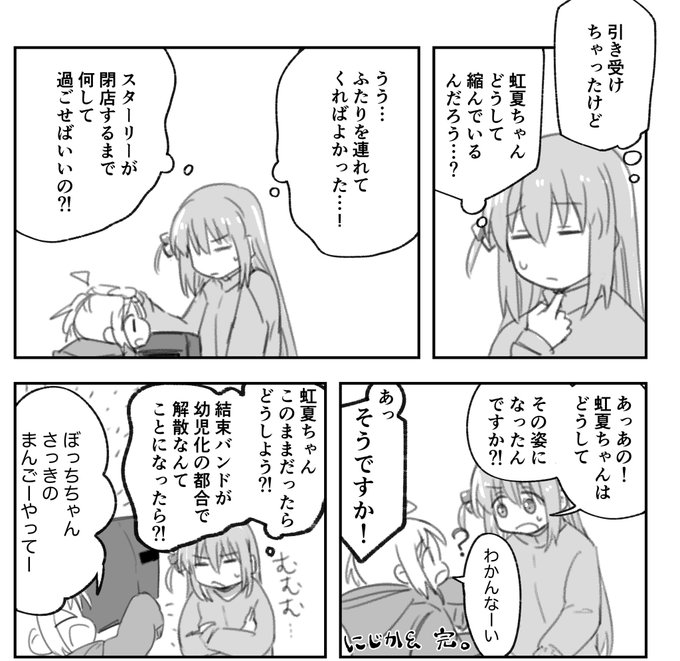 にじか&またね 冒頭少し暗いですが、伊地知姉妹のほっこりなお話になってると思います。 前作の続きですが、前の読まなくても大丈夫な内容です。 今回はぼっちちゃんと喜多ちゃんをメインに進めながら描いています。1/3