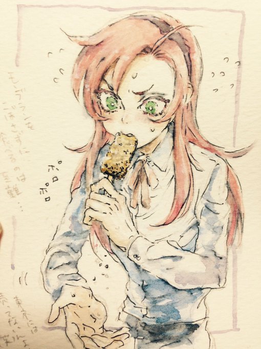 ブラックモンブランを食べるヒナイチ君 友達への残暑見舞いに書いたけどボールペンの滲みが半端ない…ボールペンでペン入れしたのが悪い…久々に絵の具使ったけど鉛筆のままの方が良かったのでは?