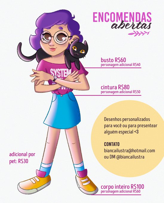 Faço comissions e tô estudando ilustração infantil para trabalhar com editorial! Sigo todos de volta, só chegar 🤙