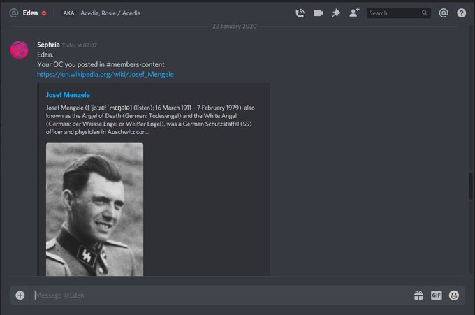 2nd. He also made a legit Na*i Hazbin OC, and got kicked out of several Hazbin Discord servers cuz of this. Notice the dates on this conversation, cuz he legit tried to "reform" that OC